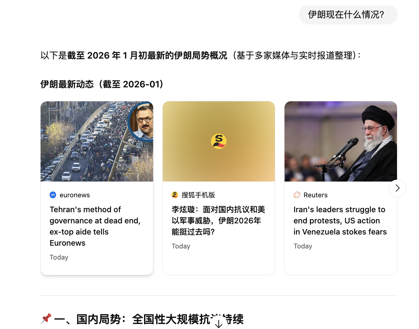 类似的情况还有最近的伊朗局势。时间线上经常是一句话配一张图,要么暗示局势升级,要么直接指向战争。我会直接问 ChatGPT:最近到底发生了什么?现在是实质变化,还是舆论放大?我并不需要特别专业的地缘政治分析,只是想知道自己看到的信息处在什么层级,而不是被时间线牵着情绪走。