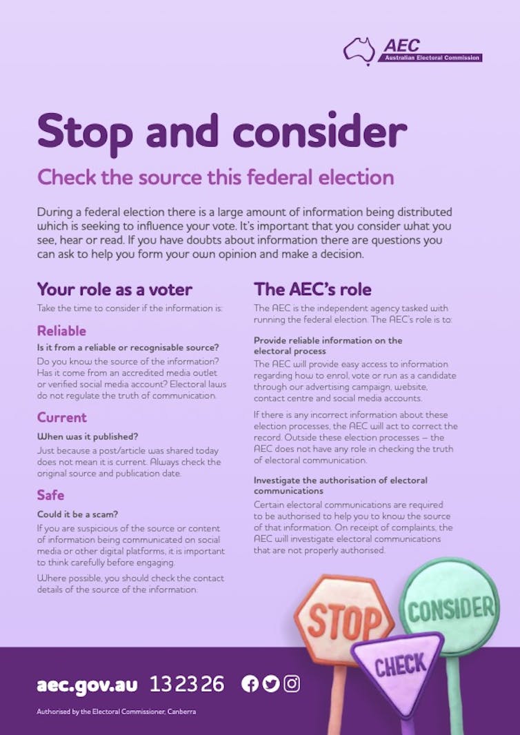 上周,澳大利亚选举委员会(AEC)重新启动了停下来考虑活动。该竞选敦促选民停下来反思,特别是关于如何投票的信息。但是它的信息适用于所有形式的错误信息。