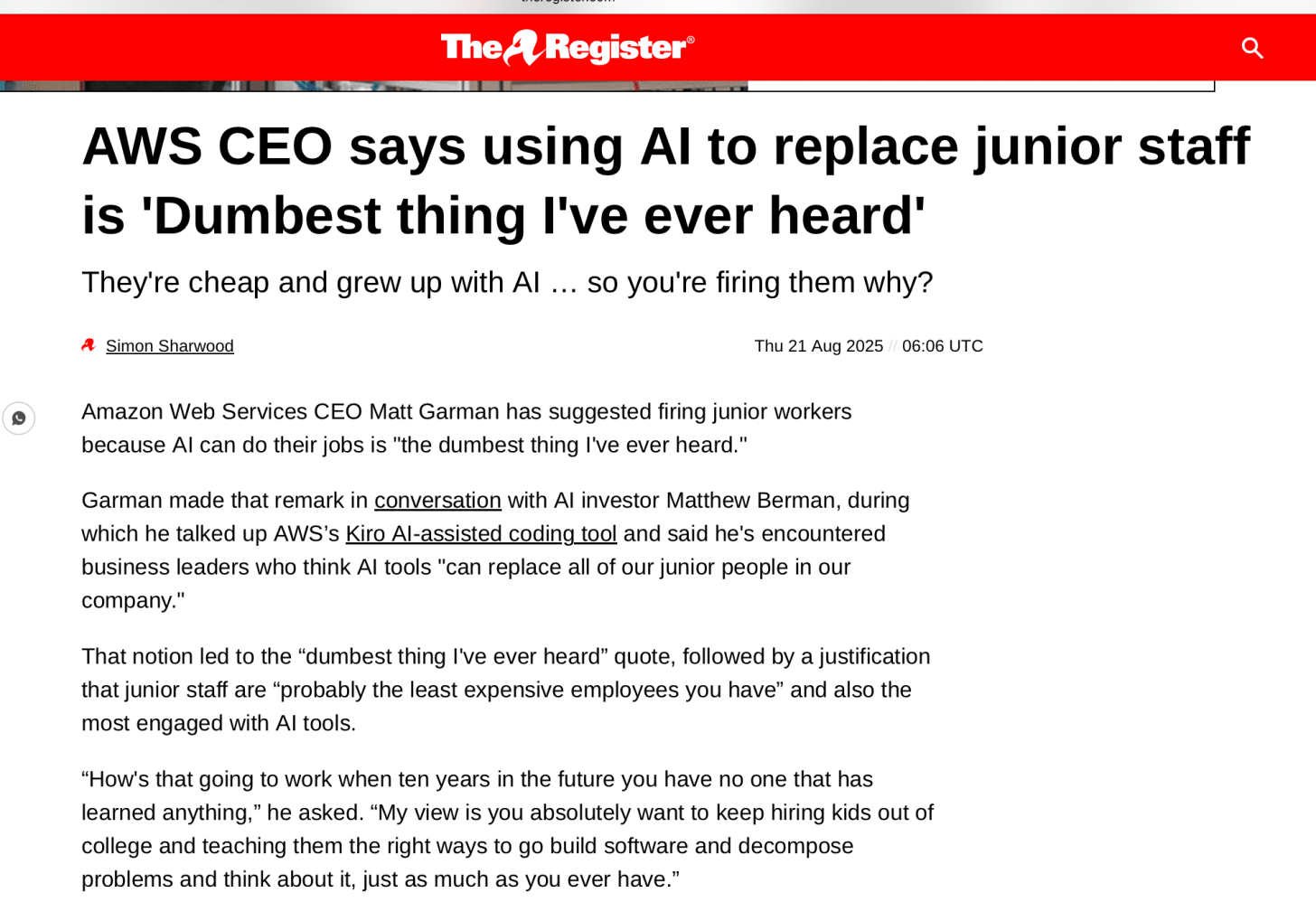 今天早上我的邮箱也是一个指针登记册中的故事,由亚马逊AWS首席执行官马特·加曼(Matt Garman),我认为很有趣,从雇主的明智的明智可以抵抗陷阱: