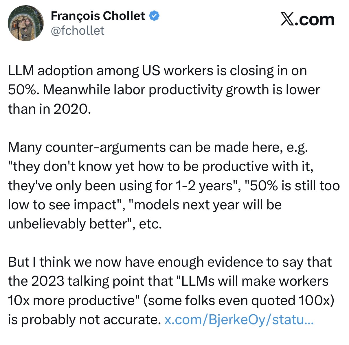 我与AWS首席执行官Garman合作:吞噬初级员工,尤其是在软件开发等领域,有利于AI(至少在目前,直到技术更加成熟和可靠)的短期游戏很容易回来雇用雇主。AI至少可以做一些初级就业可以做的工作,但通常不是全部,而AI通常缺乏高级雇员的判断力。如果我们停止雇用初级雇员,我们可能会销毁向专家的管道。