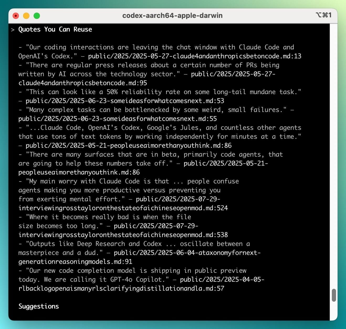 对于Claude Code vs codex CLI的细微差别,答案很昂贵。最好的是Claude Code强迫Claude Opus 4.1,但是Codex不远,并且以一个便宜得多的入口点(每月20美元)的价格出现。Codex还具有诸如Web搜索之类的不错的功能,但是在我的使用方面,它并不是一个主要的区别。1新的工作流程是在无法解决当前问题的情况下切换到另一个代理,并让它用新鲜的眼睛看到存储库,就像您将问题粘贴到另一个聊天机器人上一样。