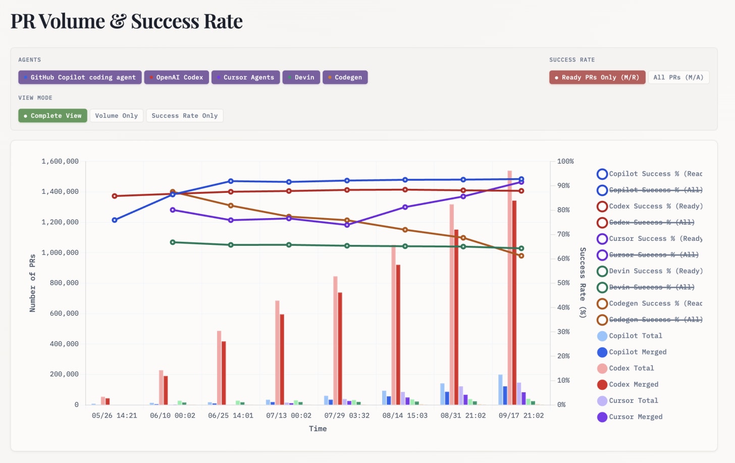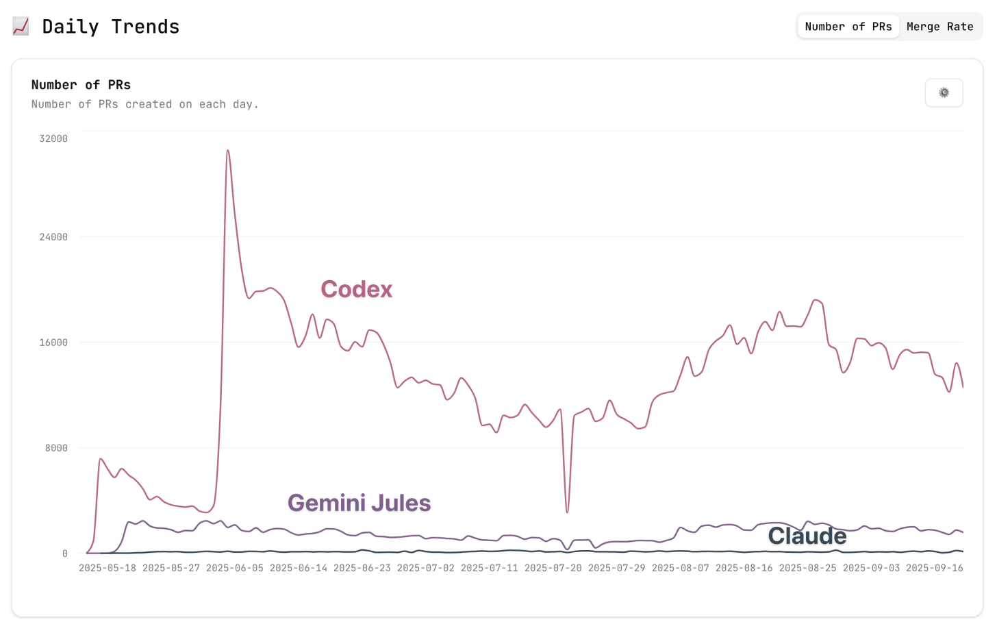 Prarena的仪表板显示,超过100万个PR从Codex Web代理商中合并,使许多竞争对手相形见war。即使Codex的Web App版本远离当今CLI代理的时代精神,这是OpenAI可以使用分配的力量。