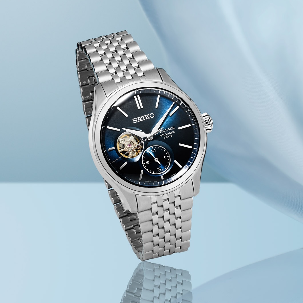 这里是拨号的新事物ai-iro日本蓝色。时间和日期经典系列SPB525在抛光标记和手中具有粒状织物的灵感,而半骨骼SPB527版本具有径向图案,重现了Raw Silk Yarn的质地。此版本的插图在9 o钟上具有切口,揭示了调节器官和24小时的次数为6oâclock。