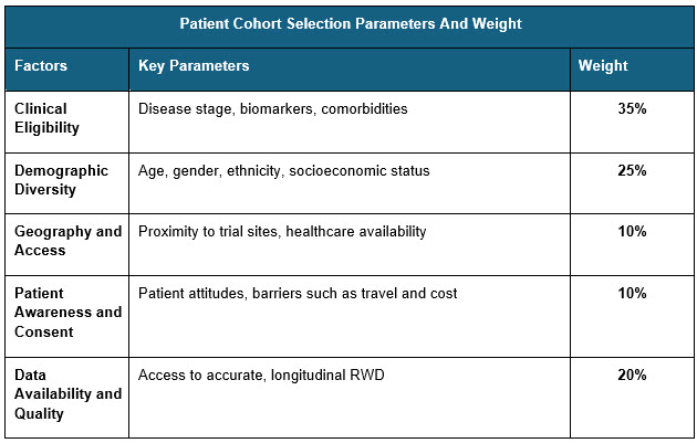 Major factors that impact patient selection are clinical, geographical, patient awareness, and demographical parameters. Evaluating each parameter and giving them an appropriate weight can help researchers determine patients’ appropriateness for a trial. Pharmaceutical companies can apply these weightage parameters to identify the most important factors when selecting the right patients for a specific therapeutic area. For instance, during RWD selection for rare diseases, it is crucial that higher weight is assigned to clinical eligibility and access parameters, since these factors exert a greater influence on the success of clinical trials.3