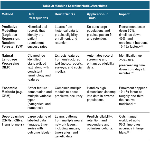 Using appropriate ML models for identifying patterns can help determine which patients are most likely to benefit from or meet the criteria for specific trials. The integration of EHRs takes this a step further by allowing real-time access to comprehensive patient data, such as medical history, diagnoses, and treatments.9-11