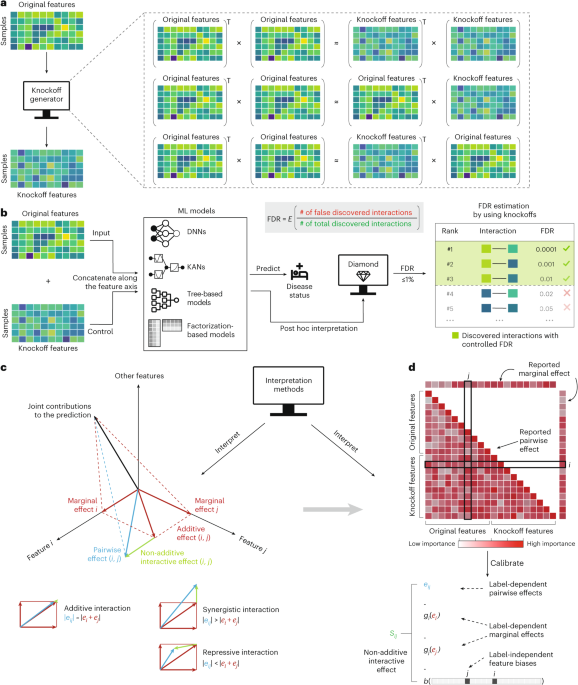Diamond consists of three key components (Fig. 1). First, Diamond achieves FDR control by leveraging the model-X knockoffs framework26,27. The core idea of this framework is to generate dummy features that perfectly mimic the empirical dependence structure among the original features and being conditionally independent of the response given the original features. Second, we discover that naively using off-the-shelf feature interaction importance measures cannot correctly control the FDR. To address this issue, we distil non-additive interaction effects from the interaction importance measures reported by existing methods, ensuring FDR control at the target level. Third, Diamond is applicable to a broad class of ML models, including DNNs, Kolmogorov–Arnold networks (KANs)28, transformer models29, tree-based models and factorization-based models. We have applied Diamond to various simulated and real datasets to demonstrate its empirical utility. Practically speaking, Diamond paves the way for the wider deployment of ML models in scientific discovery and hypothesis generation.