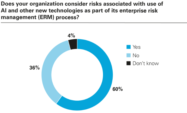 令人鼓舞的是,在考虑到ERM中这些风险的60%的受访者中,大多数(79%)声明他们拥有适当的控制权来监控和确保AI的可信赖性和可靠性及其根据适用的法律和公司政策的使用。这一发现表明,正式解决AI风险的组织也在积极实施缓解措施。
