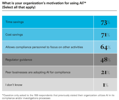 实施AI的合规性和调查背后的基本原理是务实的,重点是效率和资源优化。对于使用这些工具的受访者来说,主要驱动力是节省时间(引用73%)和成本节省(71%)。这一发现强调了对合规职能的越来越大的压力“在较少的情况下做更多的事情”来管理不断增加的风险和数据量,而不会相称地增加员工人数或预算。正如一家美国公司的道德和合规职能的一位成员所说:“我们使用AI进行合规和调查来降低体力劳动的数量。由于法规的变化和流程的复杂性,手动工作变得耗时。因此,AI的使用在某个时刻变得不可避免。”