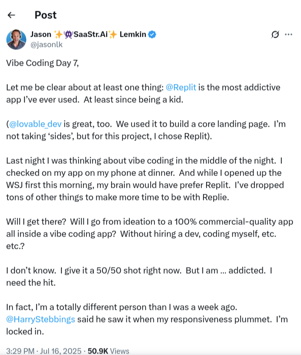 [标题:科技企业家兼SaaS社区Saastr的创始人Jason Lemkin在社交媒体上发表了有关Vibe编码的文章。]