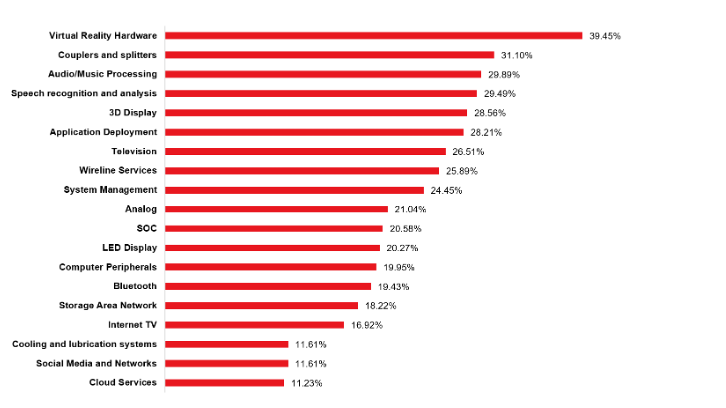 这不仅与大多数情况发生的情况有关,而且增长正在加速,而且数据确实表明某些技术正在诉讼量的显着增加(图3)。虚拟现实硬件显示了39%的复合年增长率,这意味着在过去10年中,专利诉讼案件的数量增加了10倍。涉及音频和音乐处理的争议正在稳步上升,反映了数字媒体和内容平台的竞争格局。同样,随着跨行业的扩展,随着语音应用程序的扩展,语音识别技术正在引起越来越多的法律关注。电视技术继续产生新的案例,尤其是随着流媒体和广播市场的发展。围绕蓝牙和云服务的诉讼突出了现代商业模型中连接性和数据基础架构的重要性。最后,社交媒体平台仍然是专利执行的重点,强调了塑造数字通信和用户参与的创新的价值和争议。