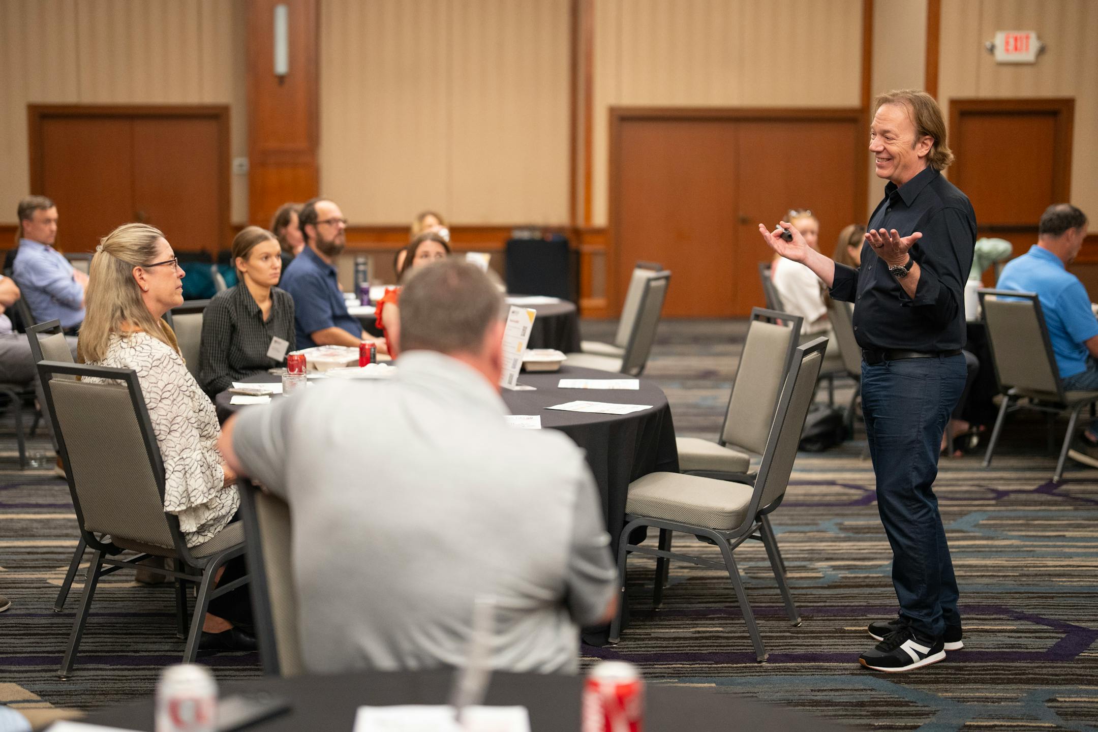 James Holmberg, co-founder of Vilas AI, speaks to a group of real estate professionals about artificial intelligence at a DoubleTree hotel in St. Louis Park on Sept. 23. (Alex Kormann/The Minnesota Star Tribune)