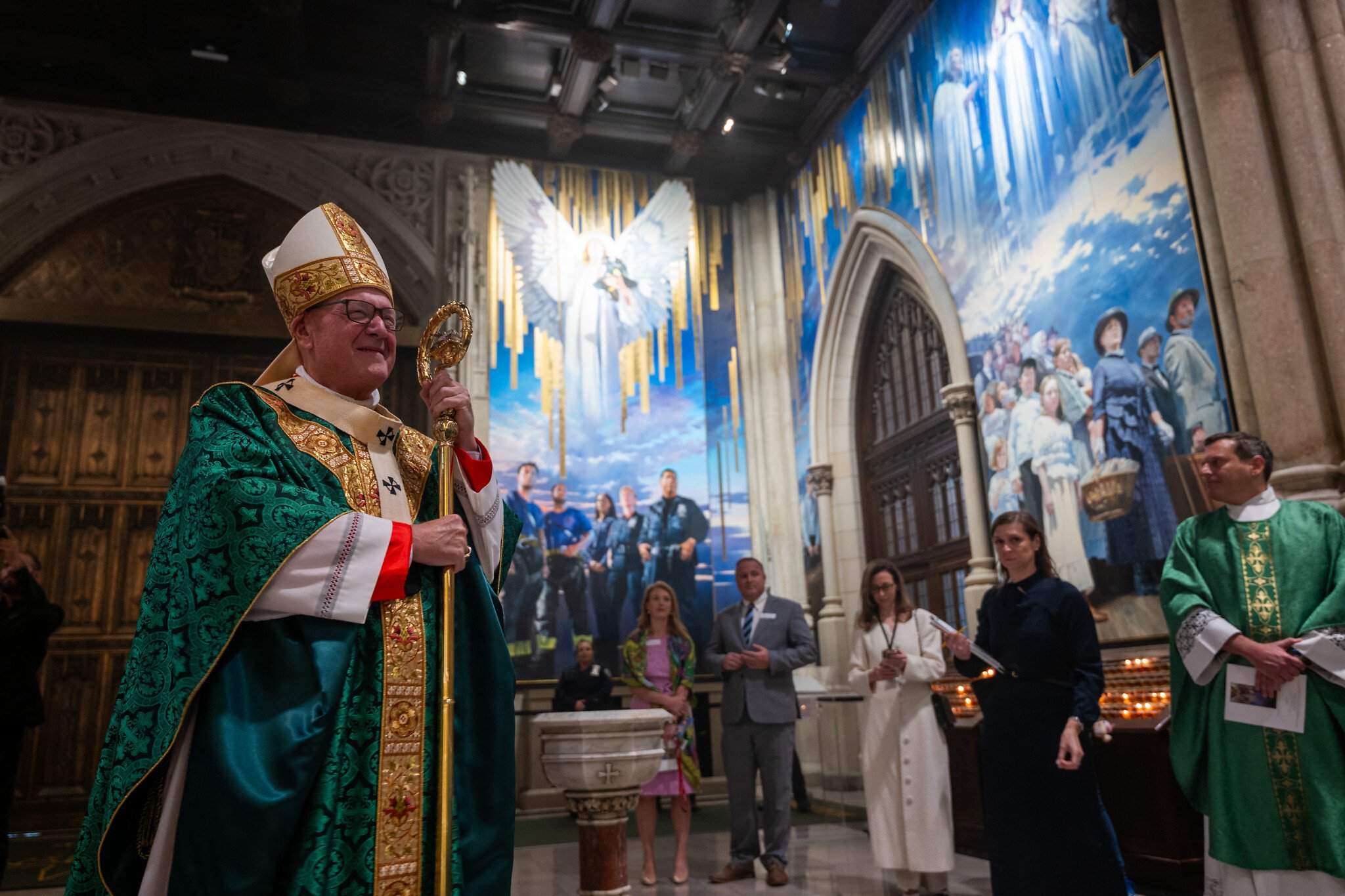 Cardinal Timothy Dolan stands under a new mural dedicated to New York City’s immigrant communities and honoring the city’s first responders during a mass at St. Patrick’s Cathedral on September 21, 2025 in New York City. (Spencer Platt / Getty Images North America / Getty Images via AFP)