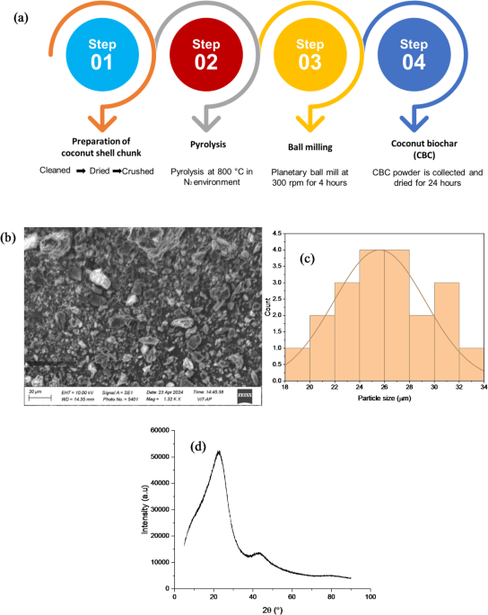 椰子壳生物炭(CCB)用作加固填充物,通过图中所示的过程制备了。 1。首先在氮(Nâ)气氛下在800°C下清洗,干燥和硫化椰子壳,该壳在壳中产生惰性环境,以防止壳壳在壳中的热分解过程中氧化和燃烧。所得的char被接地,随后以300 rpm的速度磨碎了4 h,球与粉的重量比为10:1。为了去除任何水分含量,将炭放在烤箱中24 h23。SEM分析,如图所示 1B在收集的炭上进行,以分析CCB粉末的形态,并注意到不规则的多孔颗粒。相反,粒度分析(图 1c)确认平均粒径为25英寸。图中显示的CCB粉末的XRD图案。 1d并注意到22°22°°(2区)的宽峰,归因于(002)碳的(002)平面,以及43°45°°(2î假)较弱的驼峰,对应于部分有序的碳结构。缺乏锋利的结晶峰证实了其主要无定形碳性质24。图1((