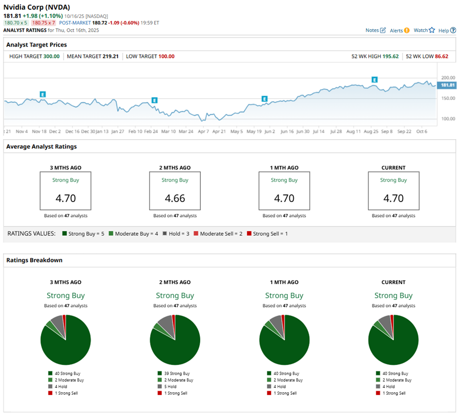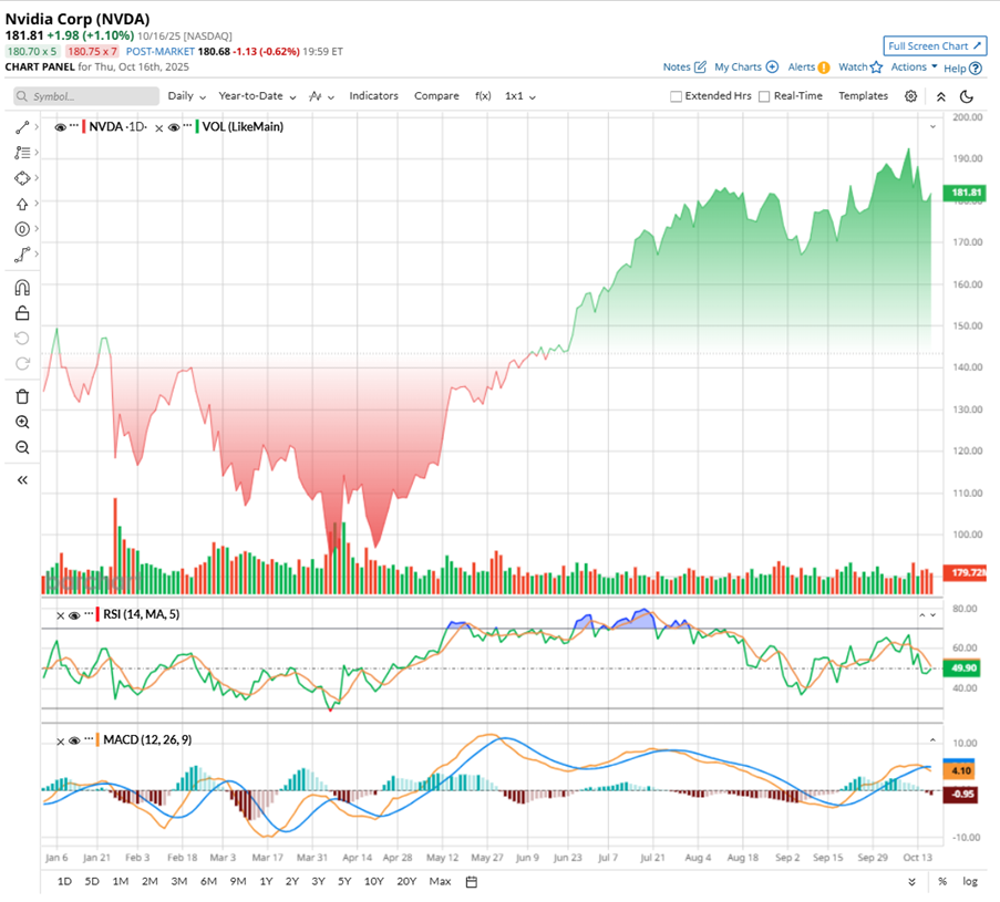 今年开局艰难——对中国的出口限制、关税上调和地缘政治紧张局势投下了长长的阴影。首席执行官黄仁勋甚至警告称,将失去 500 亿美元的市场。一时间,情绪崩溃了。然后潮流发生了逆转。NVDA 股价大幅上涨,今年迄今 (YTD) 上涨 39%, 仅在过去六个月内就增加了 75%。该股触及 10 月 10 日创下 195.62 美元的新高在回调之前。