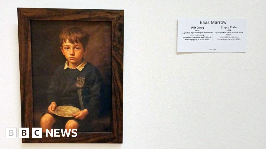 这件艺术品在打印前使用人工智能生成,由 Marrow 悬挂在博物馆的当代展区,他的网站称“空盘子”“代表 2025 年的威尔士”。