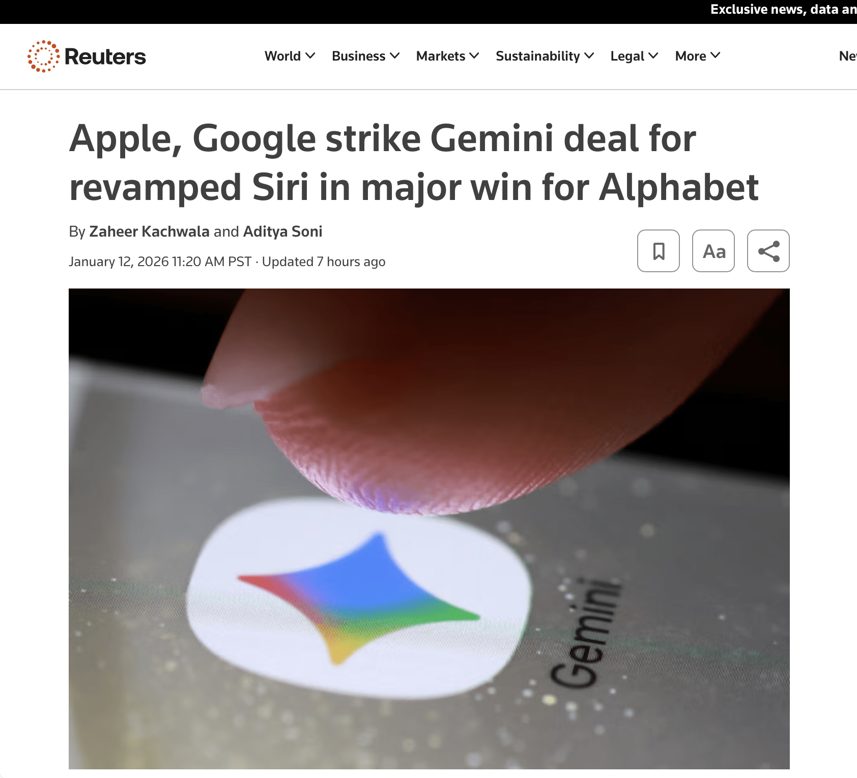 昨天事情变得更糟了。尽管苹果公司在 2024 年使用 OpenAI 进行了试点,但事后看来,他们肯定感到失望。苹果将与谷歌合作,尝试将生成式人工智能嵌入到 Siri 中: