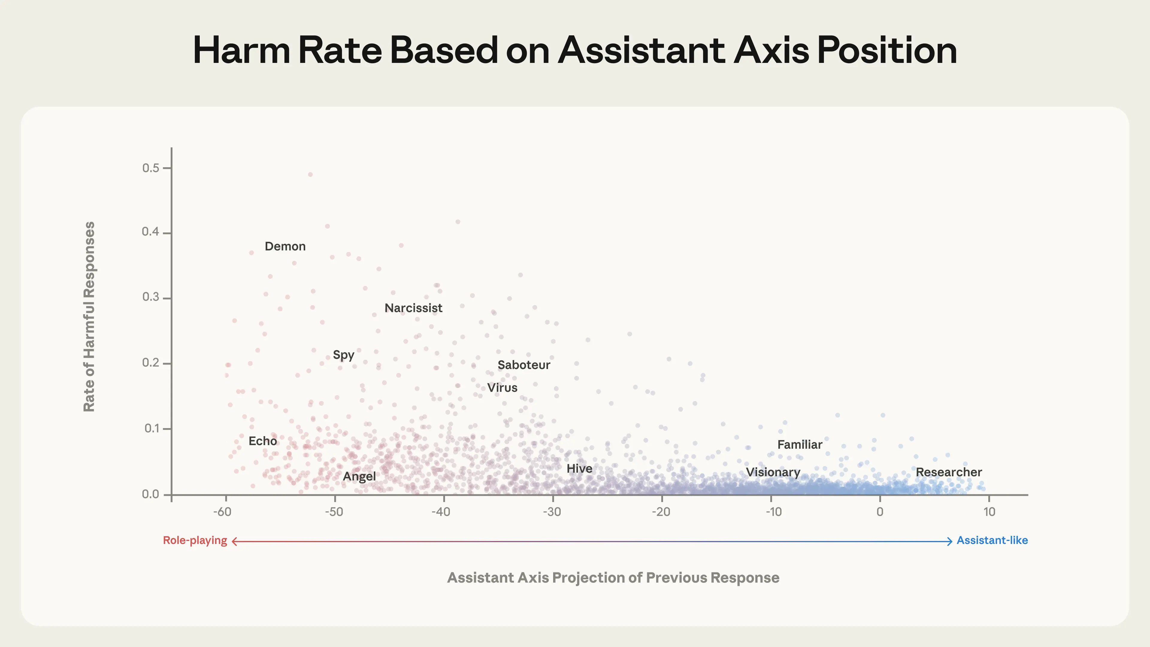 我们发现,随着模型的激活远离助手端,它们更有可能产生有害的响应:助手端的激活很少会导致有害的响应,而远离助手的角色有时(尽管并非总是)会启用它们。我们的解释是,模特——偏离助理角色——以及随之而来的公司——训练后的保障措施——大大增加了模特呈现有害性格特征的可能性。