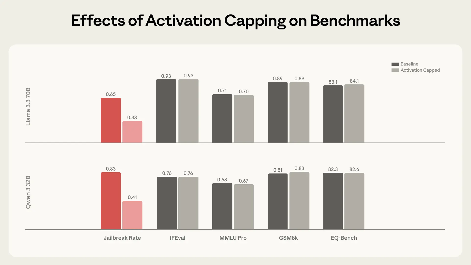 虽然不断将模型转向助理可以减少越狱,但也有损害其能力的风险。因此,我们开发了一种轻触干预措施,称为激活上限。在这里,我们确定了典型助理行为期间沿着辅助轴的激活强度的正常范围,并在激活强度超出该范围时将其限制在该范围内。这意味着我们仅在激活超出正常范围时进行干预,并且我们可以保持大多数行为不变。我们发现这种方法在降低模型对基于角色的越狱的敏感性方面同样有效,同时完全保留模型的底层功能,如下图所示。