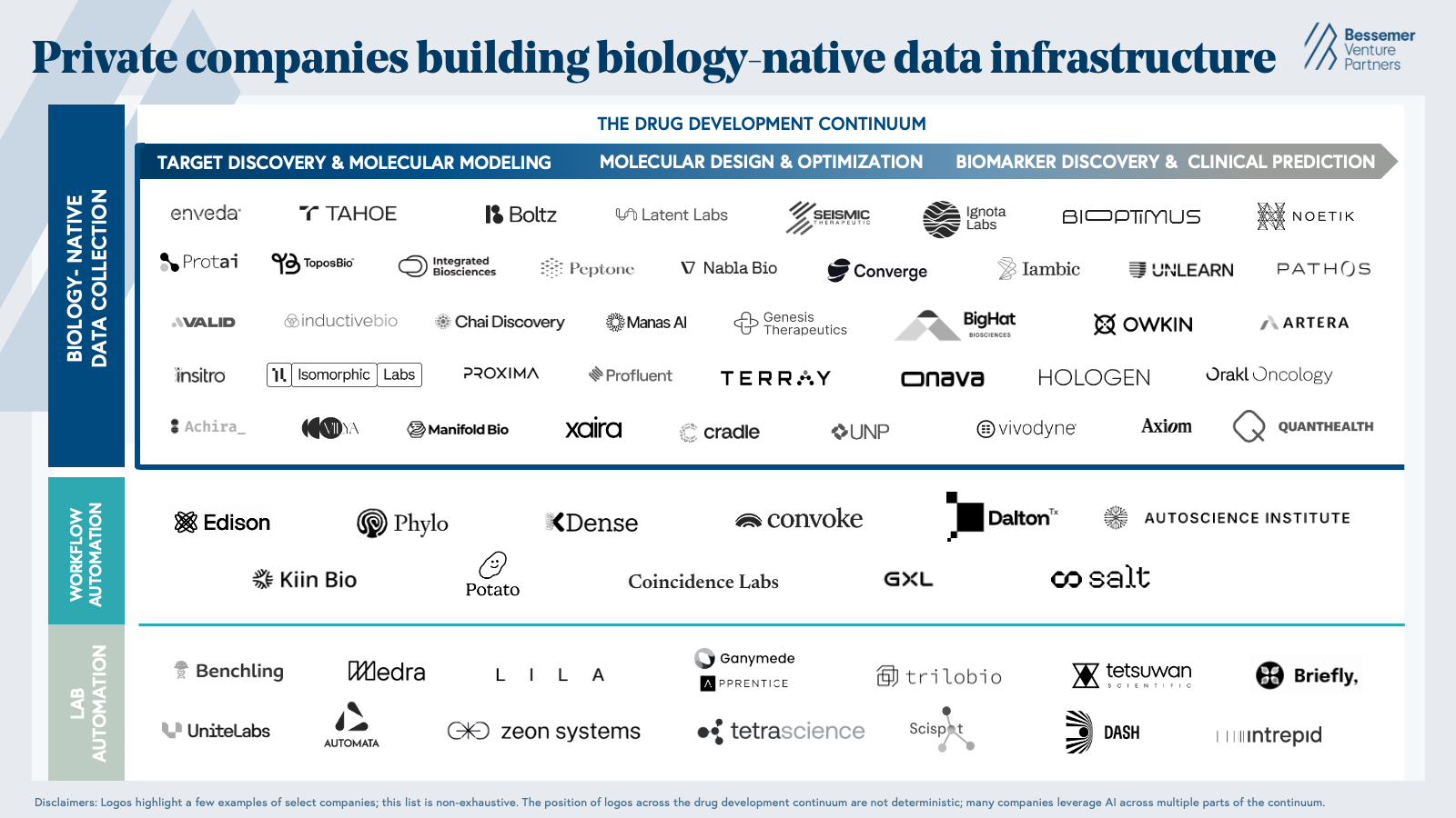 我们看到这个市场由三个相互依赖的层组成。处于领先地位的公司生成的数据具有人工智能所需的规模、模式和保真度,以便在整个药物开发过程中产生有意义的发现。它们下面是物理和软件基础设施层,包括工作流程和实验室自动化平台,可以压缩每个阶段的时间线。这三个层次共同代表了人工智能驱动的药物开发中形成的价值链的大部分,这是我们相信下一代生命科学公司将建立的核心投资领域。