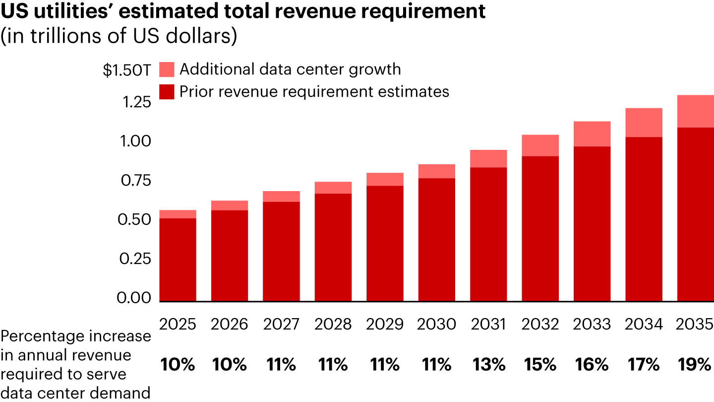 仅在美国,为了在未来十年支持数据中心的增长而充分资助资本投资,公用事业公司每年需要比之前预测的额外增加10%到19%的收入(见图3)。根据我们的分析,这可能会导致客户账单在2032年前每年逐步增加1%。